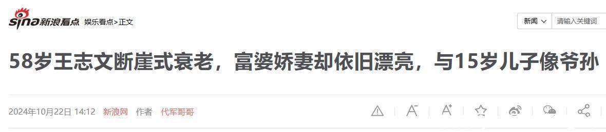信源2:新浪网 2024年10月22日 《58岁王志文断崖式衰老,富婆娇妻却依旧漂亮,与15岁儿子像爷孙》